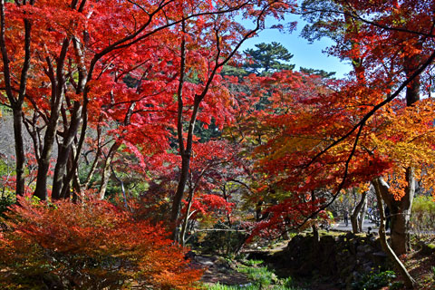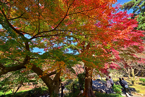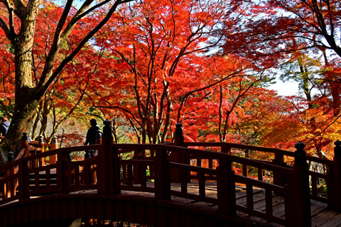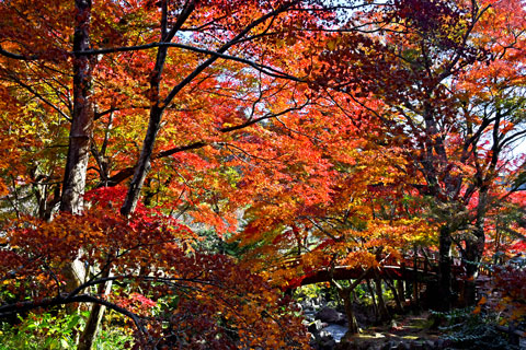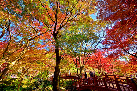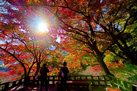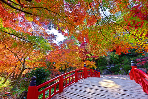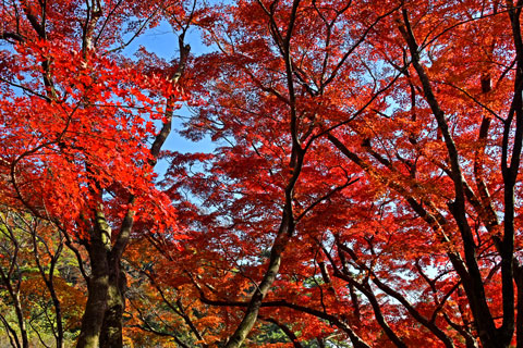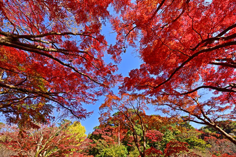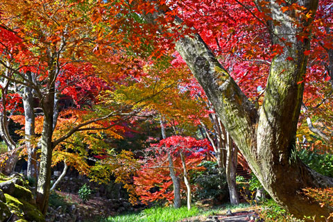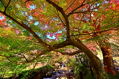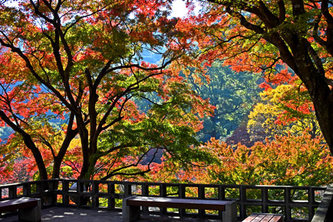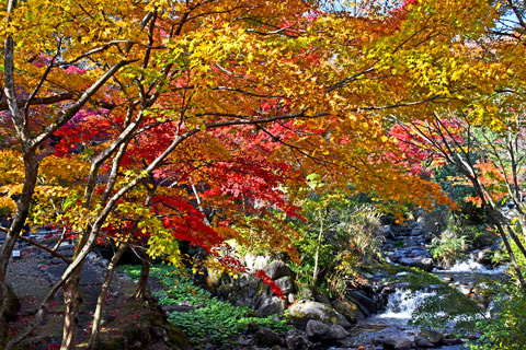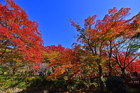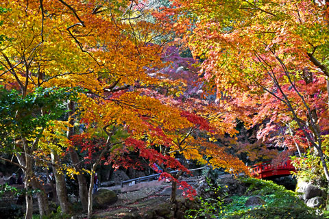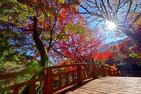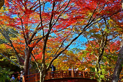 赤・黄・緑の鮮やかな色が見事に入り混じっているため、他の紅葉スポットよりも色彩豊かな紅葉を楽しむことができます。